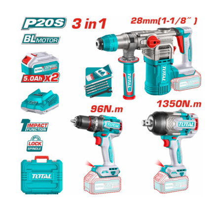 Kit Taladro Percutor 96nm + Llave de Impacto 1350nm + Rotomartillo 4.5J Inalambrico TOSLI250281 Total