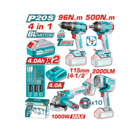 Kit Taladro Percutor 96nm + Esmeril Angular + Llave de Impacto + Lampara Inalambrico TOSLI241292 Total