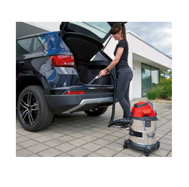 La aspiradora en seco y húmedo inalámbrica TC-VC 18/20 Li S-Solo de Einhell es un potente miembro del sistema Power X-Change, en el que baterías, cargadores y herramientas pueden combinarse de forma flexible. El depósito de acero inoxidable tiene una capacidad de hasta 20 litros y el sistema de manguera de 36 mm de diámetro permite un alto caudal de aire y suciedad. La conexión para soplado está diseñada para limpiar zonas de difícil acceso, por ejemplo en esquinas, rincones o debajo de escaleras. Cuatro ruedas giratorias resistentes garantizan buena movilidad y flexibilidad. Las boquillas y tubos de aspiración pueden guardarse de forma ordenada en el práctico soporte para accesorios. El contenido incluye una manguera de aspiración de plástico de 1,50 m y tubo de prolongación en tres partes, boquilla combinada grande, boquilla para juntas, boquilla para tapicería, además de filtro de espuma, filtro plisado y bolsa para suciedad. La batería y el cargador no están incluidos. Estos se venden por separado, por ejemplo en kits de inicio con distintas capacidades de batería y cargador.