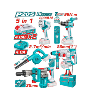Kit Inalambrico Taladro + Lampara + Soplador + Rotomartillo + Demoledor TOSLI251083 Total