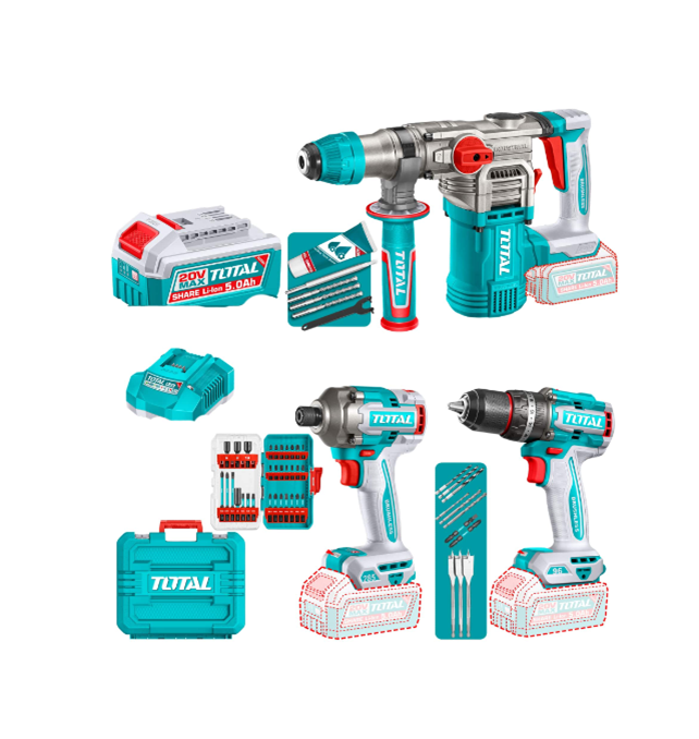 Kit Taladro Percutor 96nm + Atornillador de Impacto 285nm + Rotomartillo 4.5J Inalambrico TOSLI250693 Total